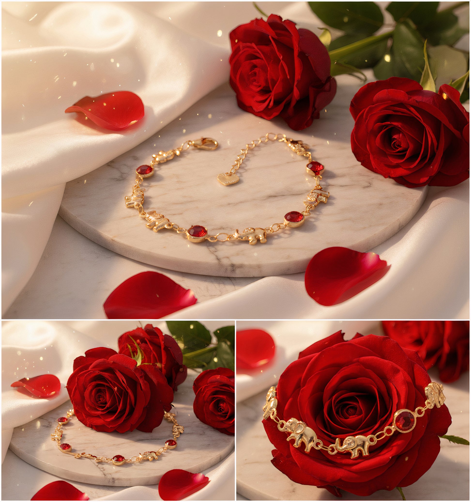 Girl, tell me this isn’t the cutest thing you’ve seen today 😍 This bracelet is giving luxury + meaning all in one. Golden elephants linked with ruby-red stones that shine every time the light hits. It’s not just jewelry—it’s a statement. Strength, beauty, and blessings all wrapped around your wrist.